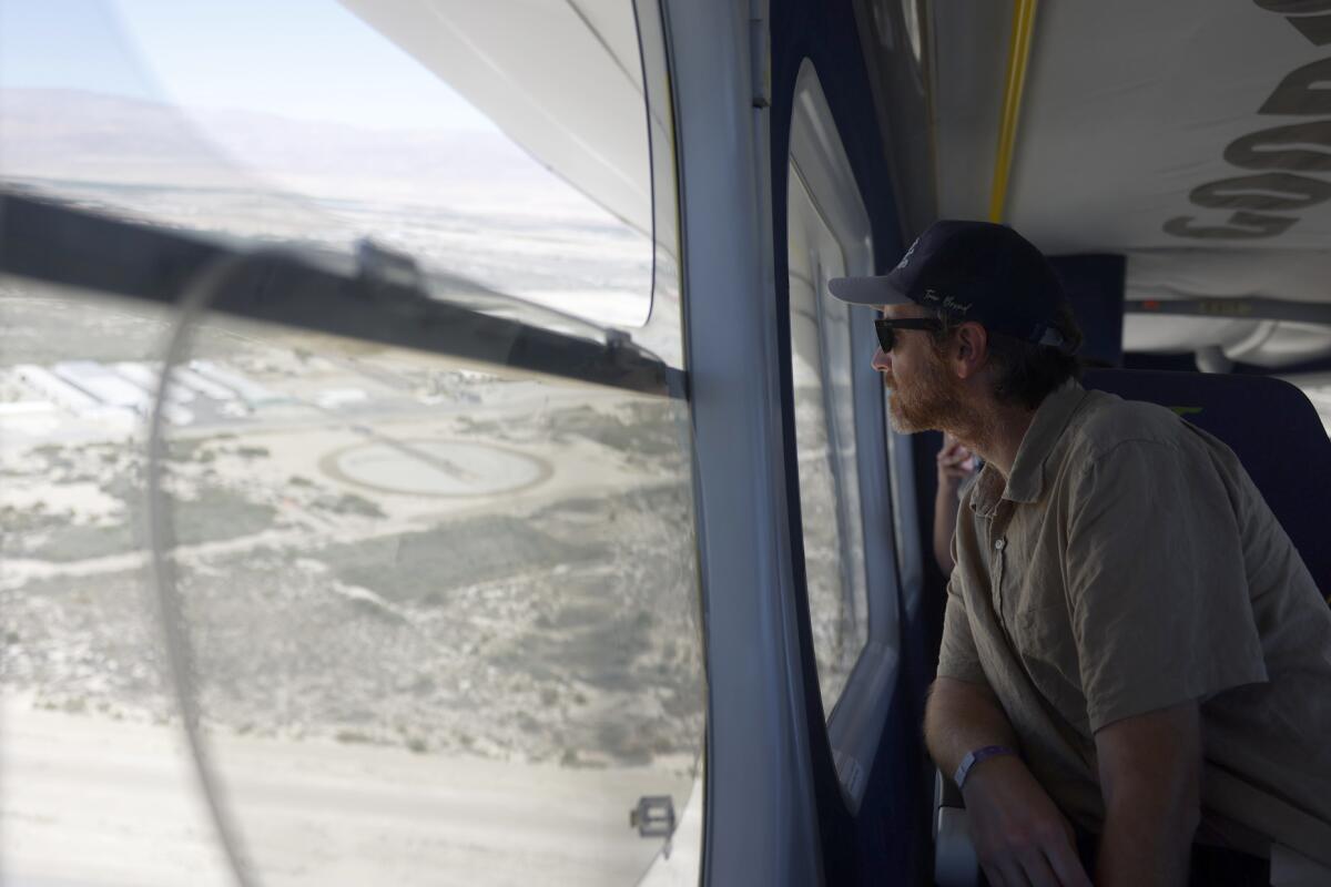 O repórter do Los Angeles Occasions, Mikael Wooden, monta o dirigível Goodyear sobrevoando Coachella