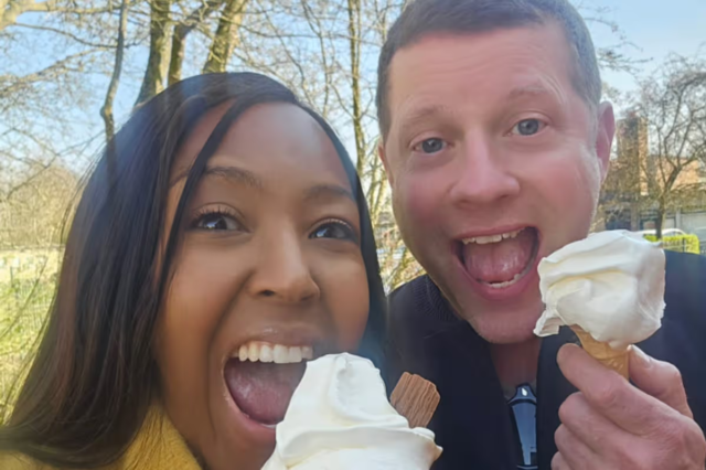 Ela disse: ‘Este foi outro momento… sinalizando uma van de sorvete na cidade natal de Dermot O’Leary, Colchester, perto de sua escola primária! Obrigada, Dermot, por me mostrar seu antigo reduto onde seu amor por contar histórias começou.