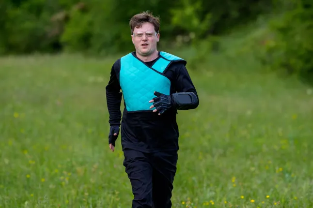 Depois de uma viagem nauseante pelas estradas ventosas da Bulgária, chego ao que parece ser uma base militar e vou para o guarda-roupa, onde estou vestido como um Energy Ranger sem energia, um pill amarrado no braço junto com um babador acolchoado azul brilhante, que presumo ser para proteção… mas brand me disseram que não servirá de proteção alguma. Ótimo.