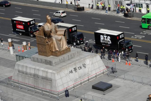 Caminhões promovendo um present de retorno do grupo masculino de Okay-pop passam pela estátua do Rei Sejong na Praça Gwanghwamun em Seul, Coreia do Sul, quinta-feira, 19 de março de 2026. | Crédito da foto: AP