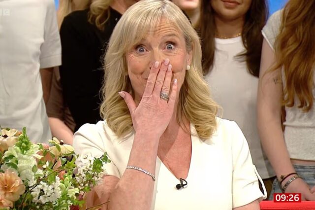 Para encerrar uma manhã cheia de surpresas, a apresentadora Sally Nugent anunciou que um “convidado realmente especial” estava chegando, antes que seu marido Steve aparecesse, que a presenteou com um enorme buquê de flores. “Você me disse que não viria”, disse Carol surpresa, enquanto Sally respondia: “Eu o fiz mentir, sinto muito!”