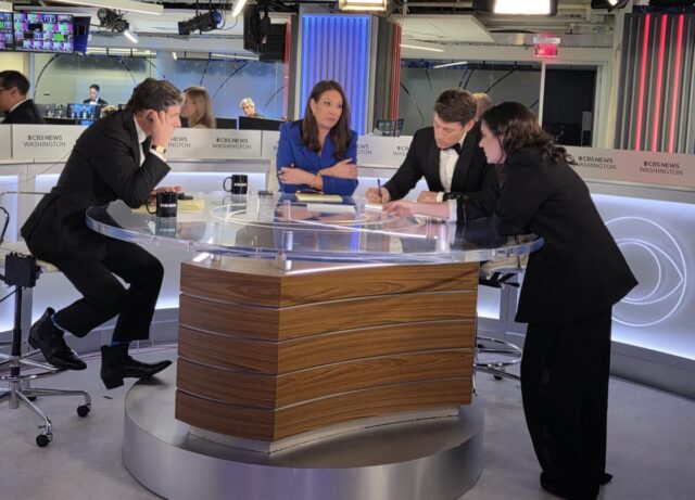Matt Gutman, Nancy Cordes, Tony Dokoupil e Bari Weiss na sucursal da CBS Information em Washington em 25 de abril de 2026.