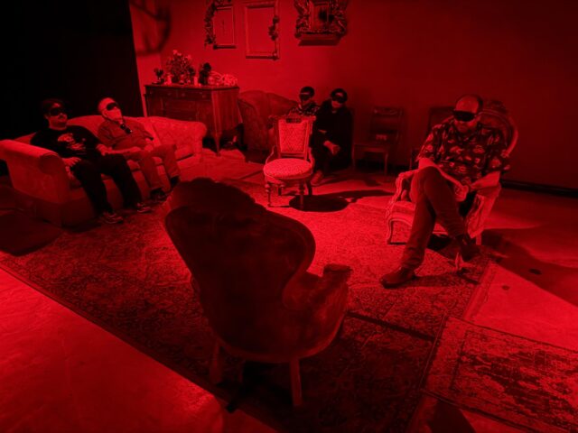 Estou com os olhos vendados e sentado em uma poltrona classic no centro de uma sala escura, iluminada em vermelho e com detalhes góticos. Um ator está atuando nas proximidades. Ouço a voz deles, mas não posso, é claro, vê-los. De repente, salto da cadeira, alarmado ao toque de algum tipo de pano – ou talvez de uma pena? – em meus tornozelos.