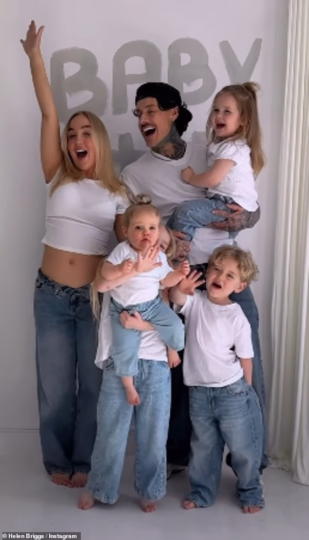 No clipe, a família estava toda vestida com blusas brancas e denims combinando antes de Helen, 30, revelar sua barriga e ultrassonografia para as crianças pela primeira vez.
