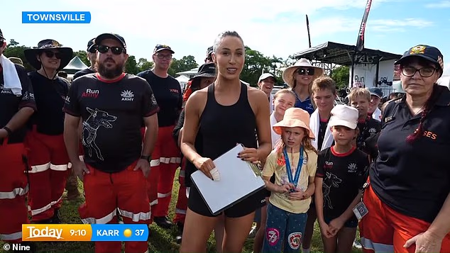 Foi difícil perder seus curativos enquanto ela fazia uma atualização do tempo em uma corrida de caridade em Townsville, equilibrando uma prancheta na mão enfaixada, apesar do ferimento.