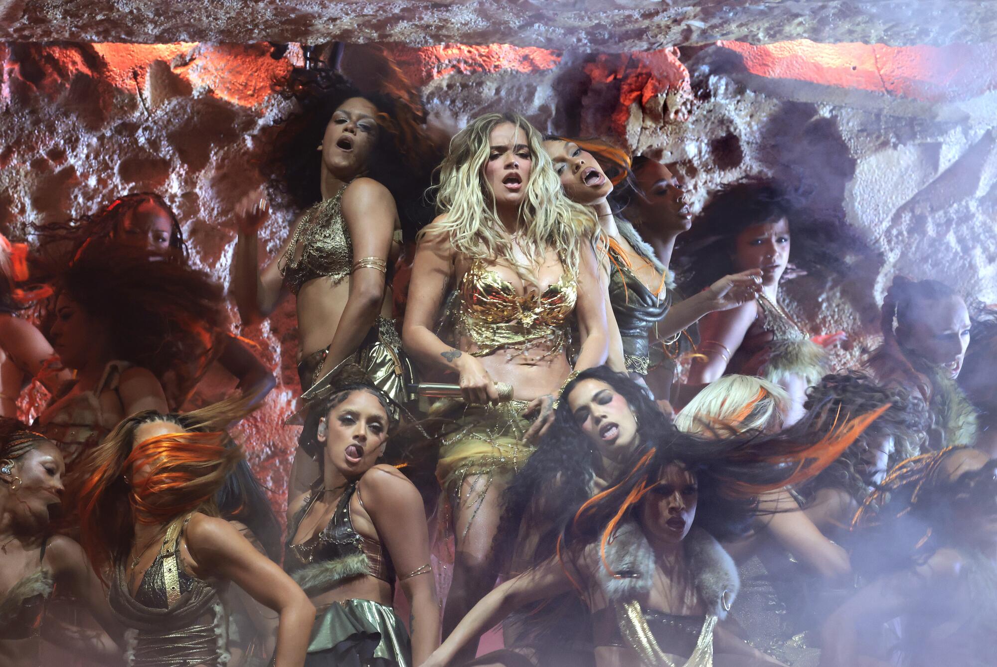 “Para sempre selvagem, para sempre livre… Latina foreva“, ela recitou nos bastidores, iniciando seu set com o número furtivo de reggaeton de mesmo nome – exaltando a deusa primordial que vive dentro de cada latina. Flautas de pã andinas vibravam enquanto ela e seus dançarinos de apoio emergiam em appears to be like brilhantes de clube da Idade da Pedra, ondulando sedutoramente de caverna em caverna, em um complexo de apartamentos paleolítico que lembrava “Os Flintstones”.