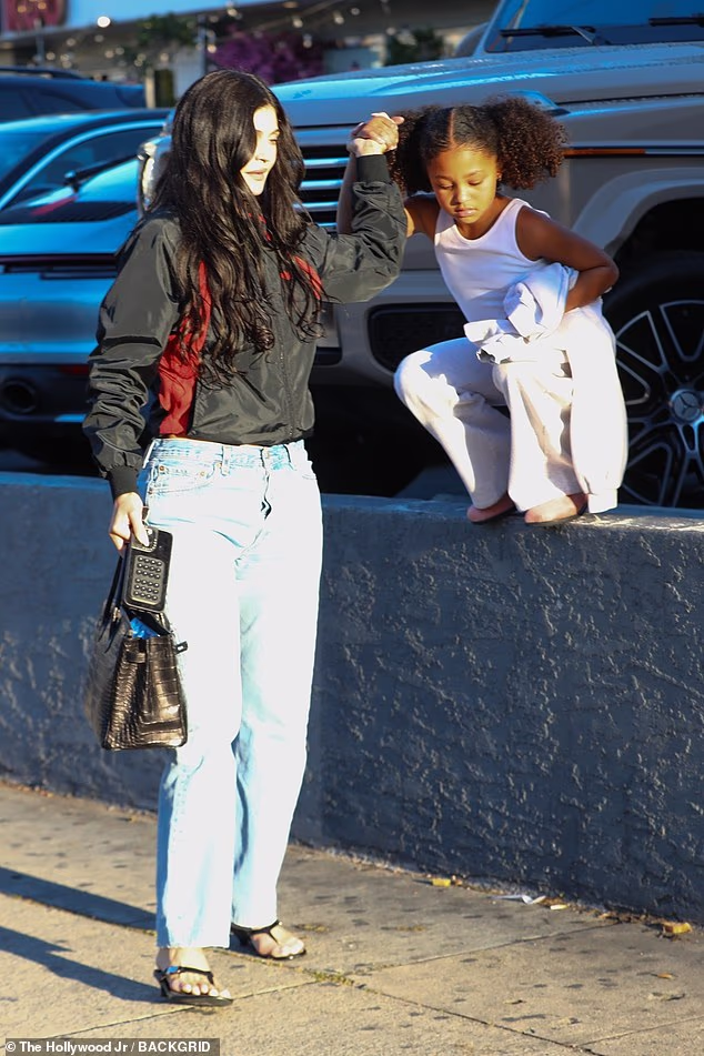 A adorável menina de oito anos agarrou-se à sua mãe famosa vestida com uma blusa branca, denims largos e sapatos marrons, enquanto carregava um moletom branco.