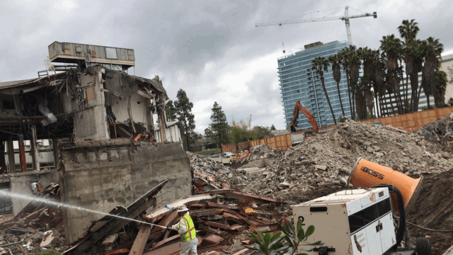 Uma equipe de demolição trabalha na remoção do Bing Theatre, projetado por William Pereira, parte do campus unique de 1965 do LACMA. Muitos angelenos tinham boas lembranças do campus e ficaram chateados com sua destruição.