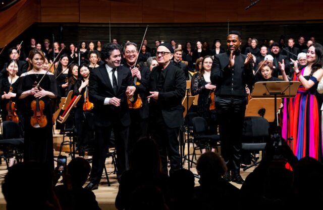 O maestro Gustavo Dudamel, a partir da esquerda, o compositor David Lang, o baixo-barítono Davone Tines e a mezzo-soprano Fleur Barron abrem o palco após a estreia mundial da Filarmônica de Nova York de ‘a riqueza das nações’ de Lang no David Geffen Corridor, Lincoln Middle, Nova York.