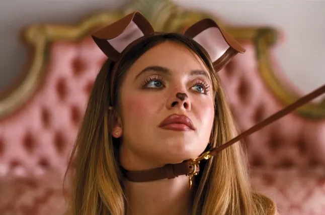 Em outro, Cassie de Sweeney está vestida de cachorro, com coleira e trela, durante uma troca com seu marido outrora psicótico, mas agora aparentemente castrado, Nate (Elordi).