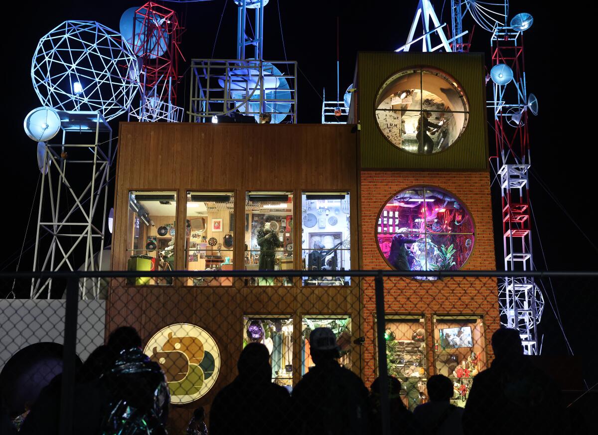 Vanessa Bonet, do grupo de arte de instalação Dedo Vabo, observou através de um monitor de controle de missão, enquanto a nave movimentada subia para uma sala cheia de hipopótamos zurrando em ternos amarrotados. As feras estavam, aparentemente, comandando um ameaçador conglomerado de comunicações em uma torre de satélite com vista para o campo principal do Coachella, mas agora estavam assustados. Eles correram pelo escritório que se erguia acima do palco Outside, enquanto fãs encantados no chão os observavam se debatendo atrás de um vidro.