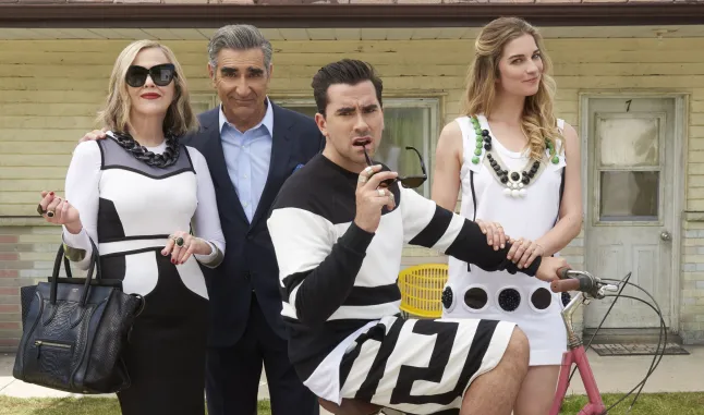 Catherine, que morreu no início deste ano aos 71 anos, interpreta a incomparável matriarca Moira Rose – uma ex-estrela de novela que tem tantas piadas quanto sapatos (muitos!). Enquanto Daniel e Annie interpretam as crianças hilariamente mimadas David e Alexis, Eugene é a presença mais racional em um mar de caos inicial, que encontra um propósito ajudando a administrar o motel da cidade.