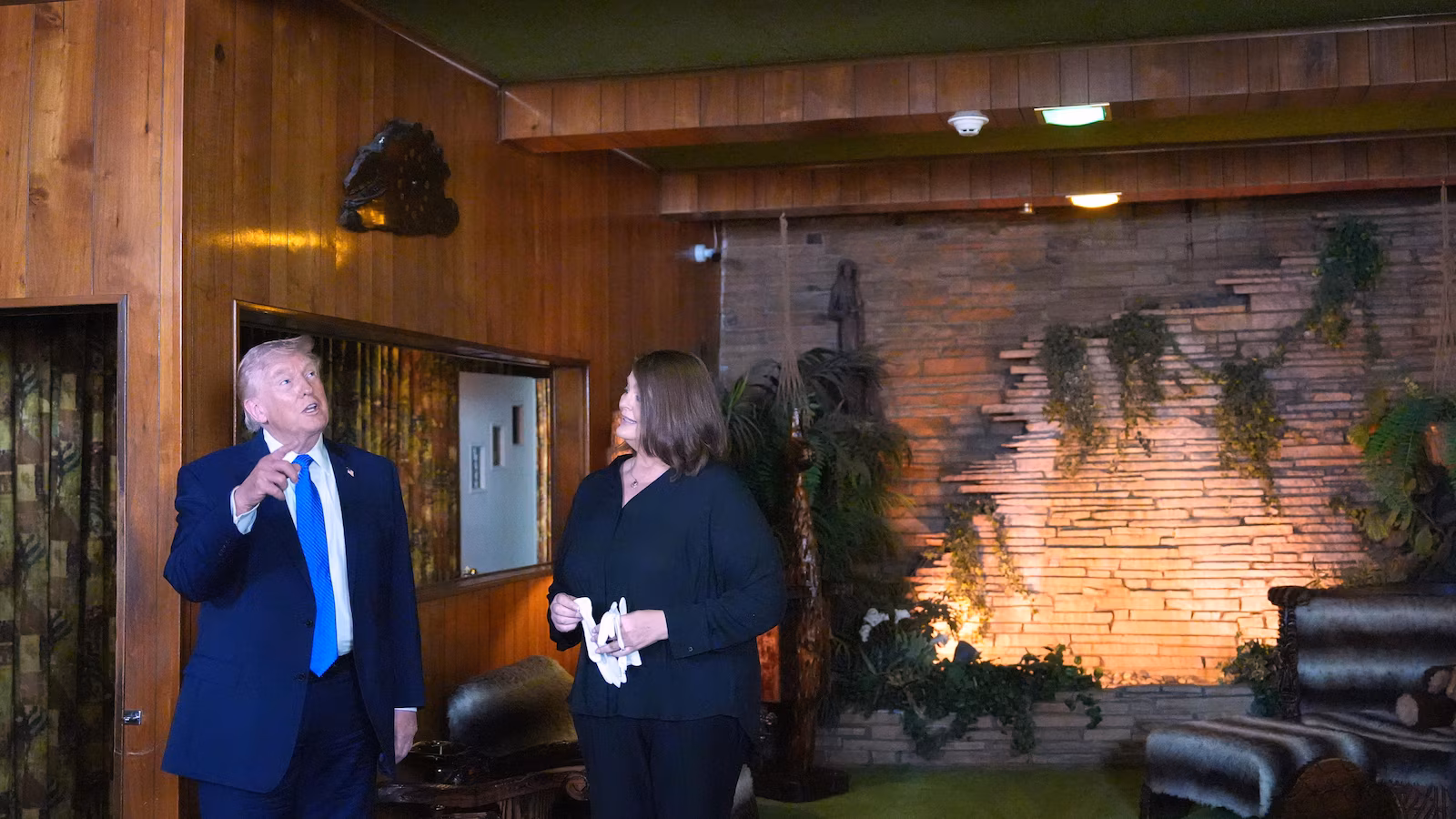 Graceland fechou temporariamente para que Trump pudesse fazer um breve tour privado, incluindo examinar um capacete do Exército que Presley rabiscou suas iniciais “EP” depois de se apresentar ao treinamento básico em 1958. Ele também procurou um aquecedor de pão na cozinha e caminhou pela sala conhecida como “Sala da Selva” por causa de seu tapete verde felpudo, móveis de estilo polinésio e cachoeira de pedra interna.