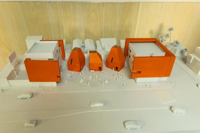 Um modelo arquitetônico dos planos futuros do artista Sr. Wash para um centro artístico comunitário em Compton que forneceria espaço de estúdio, educação artística e apoio para indivíduos anteriormente encarcerados.