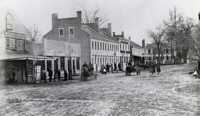 A Parkman Home, onde a família Thoreau morou por um tempo, em Downtown Harmony, Massachusetts, na década de 1860, é a casa visível mais à direita ao fundo.