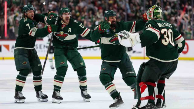 Ryan Hartman, há muito um dos jogadores mais penalizados do Wild, foi apitado por interferência do goleiro apenas aos 4:31 do jogo. Robertson respondeu recuperando um rebote depois que Matt Duchene – que tem sete pontos em quatro jogos – acertou um chute de fora da área que ricocheteou em Wallstedt.