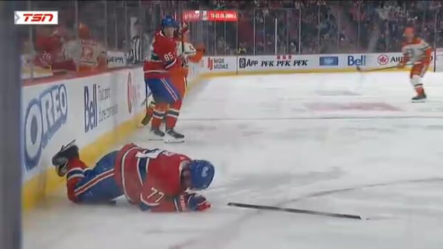 O número 77 parece se abençoar à épaule depois de chutar lourdement sur la patinoire.