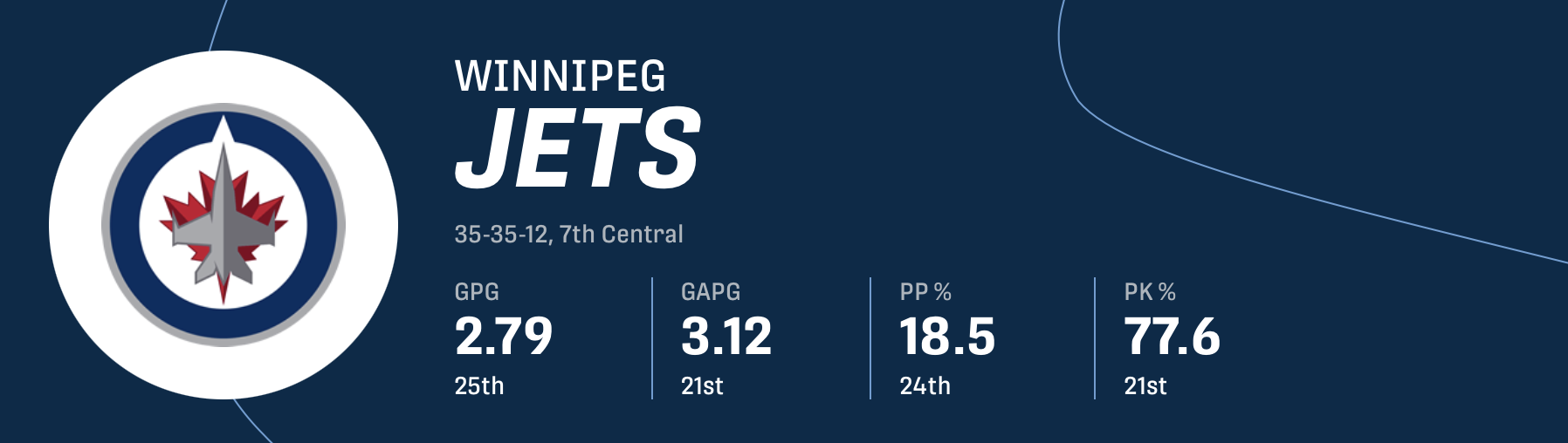 Em 2024-25, os Jets marcaram em média 3,35 gols por jogo, tiveram um energy play de 28,9 por cento e um pênalti de 79,4 por cento. Nesta temporada, os Jets tiveram uma média de apenas 2,79 gols por jogo, um energy play de 18,5% e um pênalti de 77,6%.