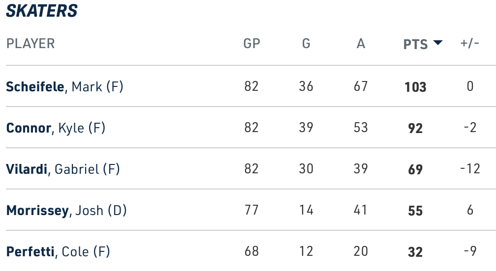 Scheifele alcançou 100 pontos pela primeira vez em sua carreira e Kyle Connor por pouco perdeu a marca de 40 gols pela segunda temporada consecutiva, mas o que realmente se destaca é o fato de que os artilheiros de Winnipeg tiveram menos 17 nesta temporada. No ano passado, seus cinco maiores artilheiros somaram mais 69.
