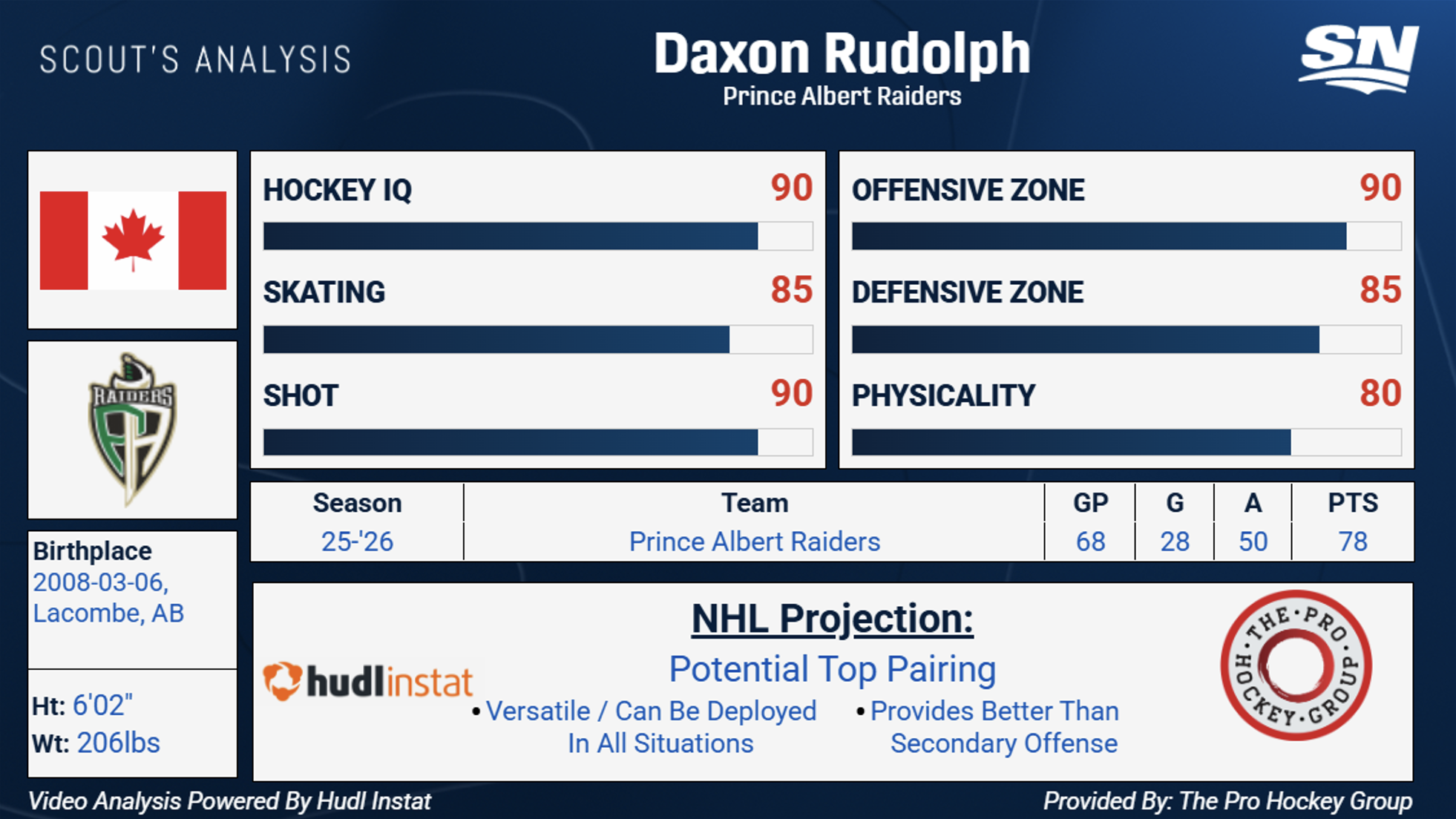 Daxon Rudolph, 1,80m, 206 libras, defensor de tiro direito, Prince Albert Raiders (WHL)
