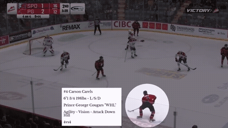 Aqui está um exemplo de como Carels pode ser evasivo na zona ofensiva. Sua agilidade e visão estão totalmente expostas neste clipe, incluindo como ele ataca o meio do gelo assim que vê uma oportunidade de acertar um disco de um native de alto perigo no slot profundo: