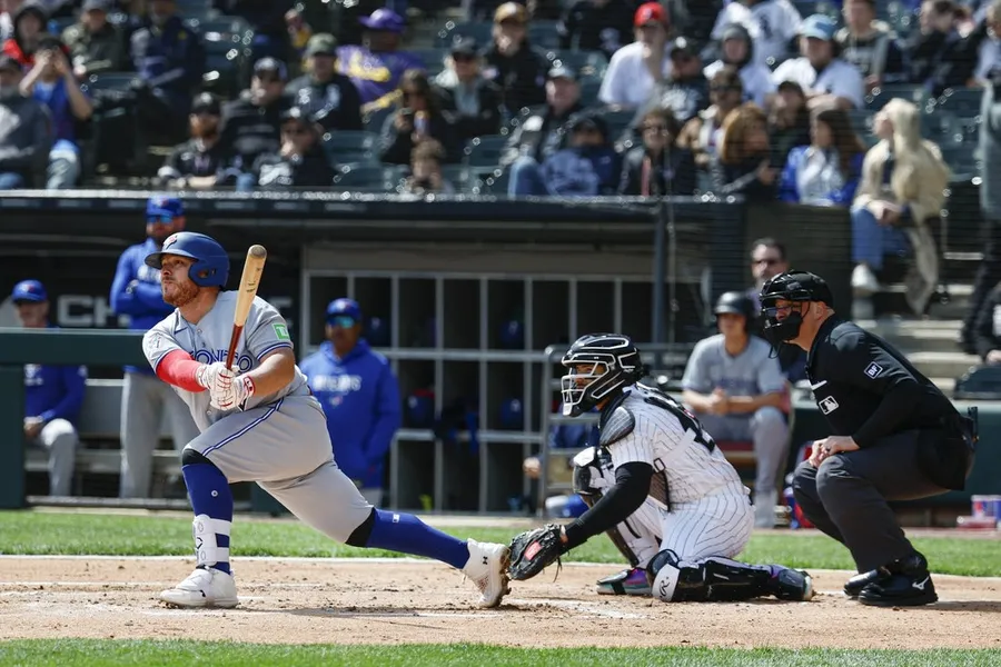 3 de abril de 2026; Chicago, Illinois, EUA; O apanhador do Toronto Blue Jays, Alejandro Kirk (30), acerta um RBI duplo contra o Chicago White Sox durante o segundo turno no Charge Area. Crédito obrigatório: Kamil Krzaczynski-Imagn Photographs