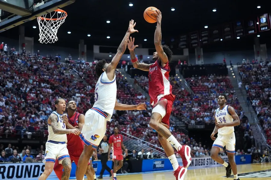 22 de março de 2026; San Diego, CA, EUA; O atacante do St. John’s Crimson Storm, Dillon Mitchell (1), arremessa contra o atacante do Kansas Jayhawks, Bryson Tiller (15), no primeiro tempo, durante um jogo da segunda rodada do torneio masculino da NCAA de 2026 na Viejas Enviornment. Crédito obrigatório: Kirby Lee-Imagn Photos