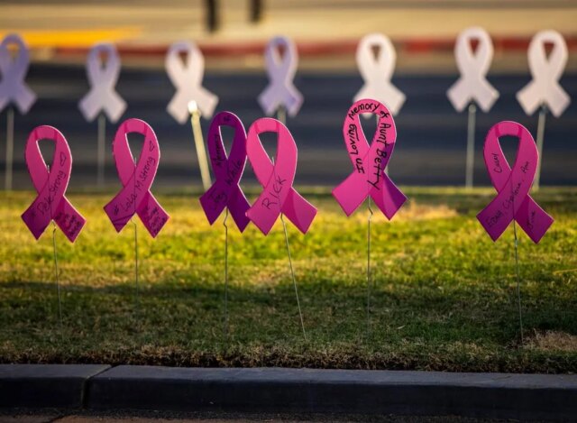 Fitas cor de rosa com nomes de sobreviventes do câncer de mama e de pessoas perdidas devido à doença são vistas durante o Paint El Paseo Pink em Palm Desert, Califórnia, sábado, 8 de outubro de 2022.