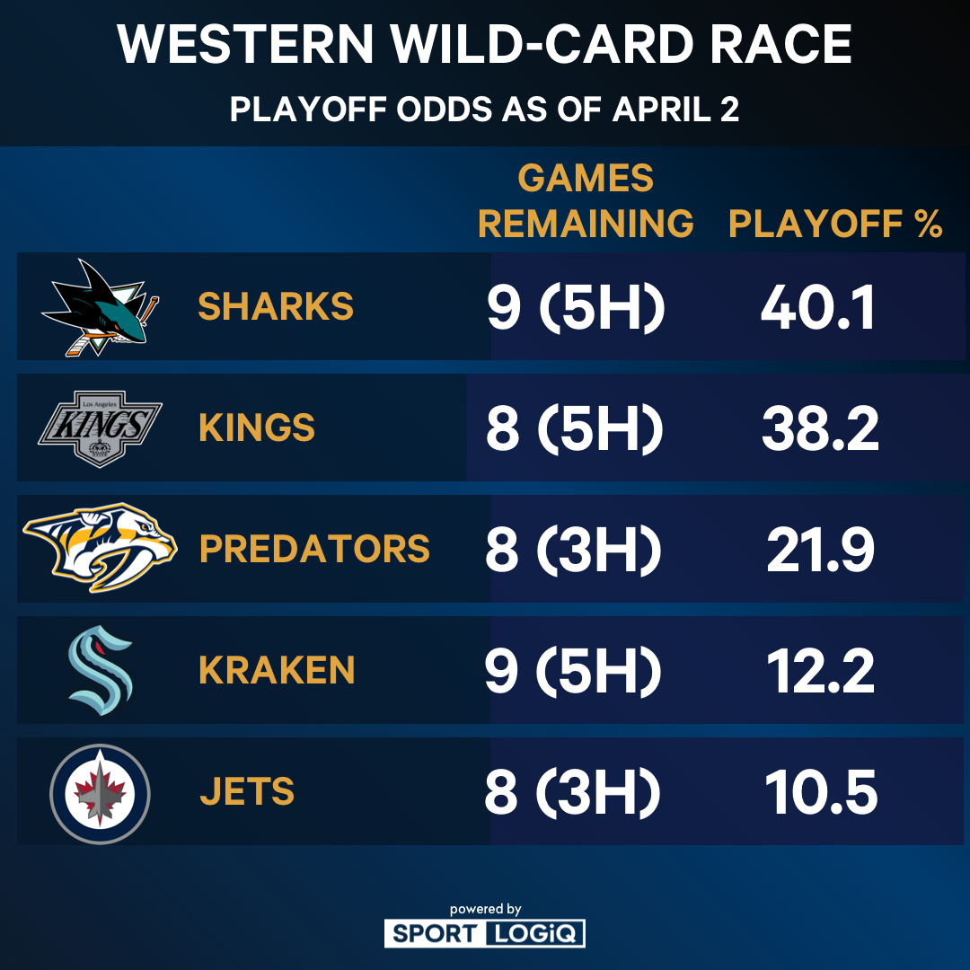 Cinco equipes estão a quatro pontos da vaga remaining nos playoffs do Los Angeles Kings. Isso inclui os Winnipeg Jets, que estavam 11 pontos atrás no intervalo olímpico, mas somaram pontos em 14 dos últimos 18 jogos (10-4-4). A qualificação de Winnipeg para os playoffs representaria uma reviravolta notável depois de ficar em último lugar na NHL em 8 de janeiro.