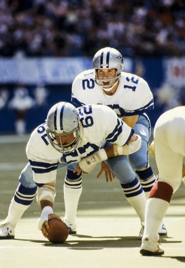 21 de outubro de 1979; Irving, Texas, EUA; FOTO DO ARQUIVO; O quarterback do Dallas Cowboys, Roger Staubach (12), alinhou sob o comando do pivô John Fitzgerald (62) contra o St. Louis Cardinals no Texas Stadium. Crédito obrigatório Herb Weitman-Imagn Imagens
