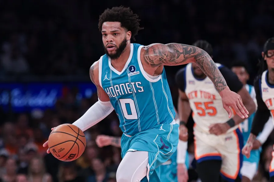 Brandon Miller, LaMelo Ball e Coby White marcaram 19 pontos cada um e o visitante Charlotte Hornets conquistou a nona posição no torneio play-in da Conferência Leste com uma vitória por 110-96 sobre o New York Knicks no domingo.