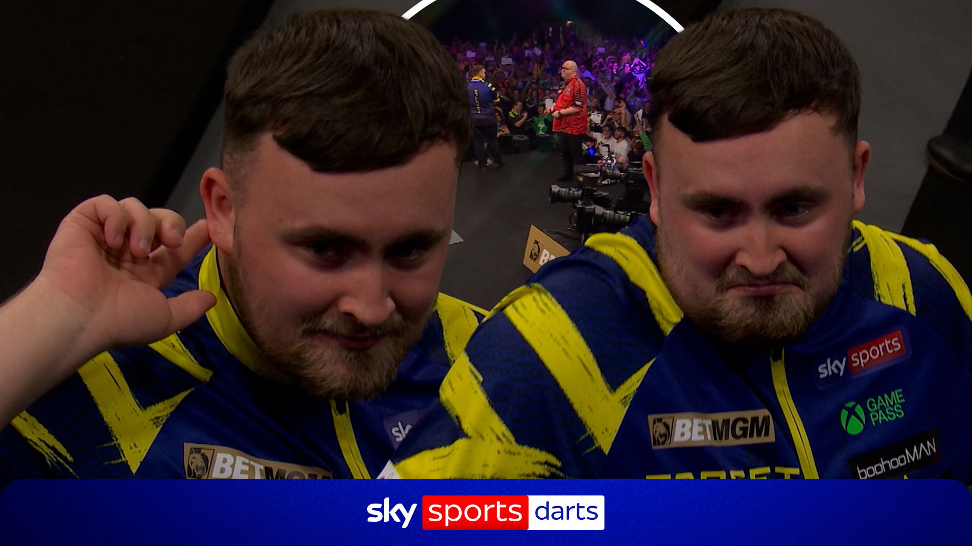 Luke Littler reage à multidão de Brighton encolhendo os ombros e apontando para o ouvido após ouvir algumas vaias durante sua caminhada.