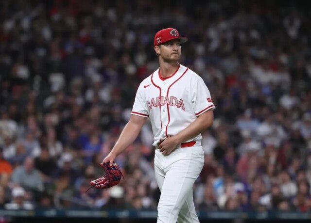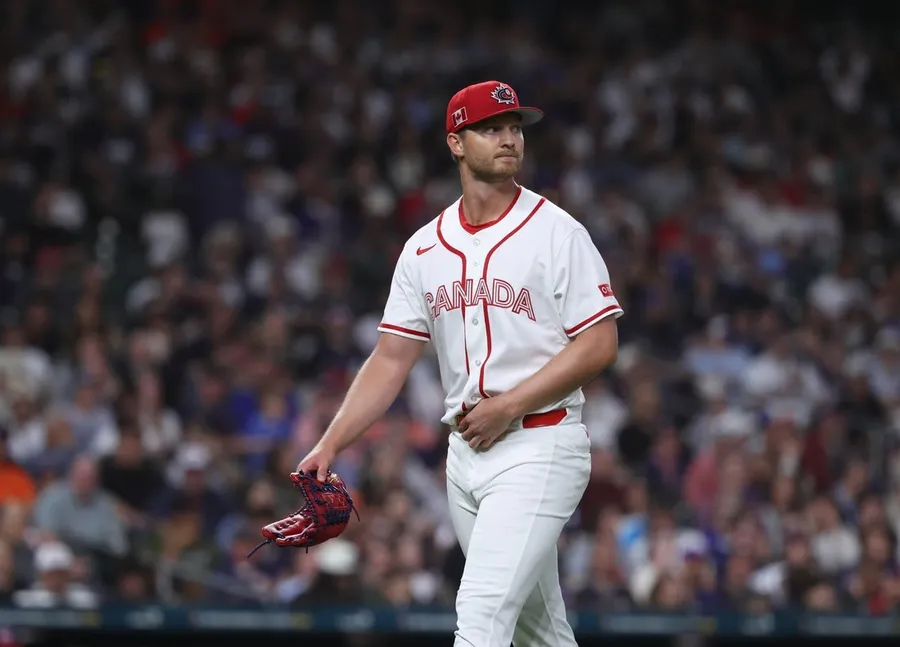 13 de março de 2026; Houston, Texas, Estados Unidos; O arremessador titular do Canadá, Michael Soroka (40), volta ao banco de reservas durante o segundo turno contra os Estados Unidos durante um jogo das quartas de ultimate do 2026 World Baseball Traditional em Daikin Park. Crédito obrigatório: Troy Taormina-Imagn Photographs