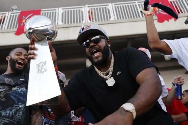 10 de fevereiro de 2021; Tampa Bay, Flórida, EUA; O ataque ofensivo do Tampa Bay Buccaneers, Donovan Smith, dança com o Troféu Vince Lombardi durante um desfile de barcos para comemorar a vitória no Tremendous Bowl LV contra o Kansas Metropolis Chiefs. Crédito obrigatório: Kim Klement-Imagn Pictures