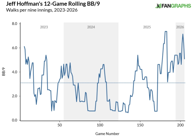 Bolas caindo em rebatidas não é o único problema de Hoffman. O destro também não está dando golpes suficientes. A sua taxa de caminhada (5,06 BB/9) é alta para um apaziguador de alta alavancagem e, mesmo no contexto de uma amostra de 12 jogos, é um dos seus maiores picos nos últimos anos.
