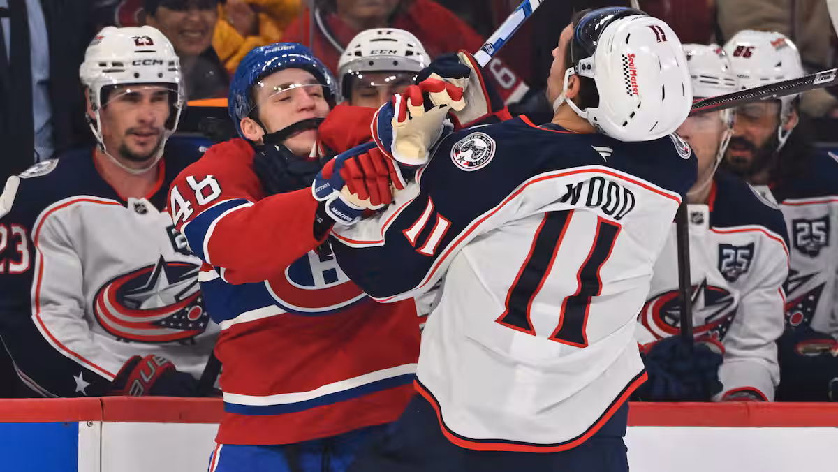 Em frente aos Blue Jackets de Columbus, quando, depois de uma mise en échec, ele tentou recuperar Miles Wooden, que mede 6 pi 2 po e pesa 210 lb, comparativamente a 5 pi 9 e 162 lb de Hutson. Jake Evans é o principal native de defesa. (À vista no vídeo principal.)