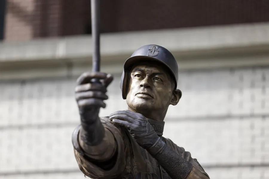 Enquanto os colegas do Corridor da Fama Ken Griffey Jr. e Edgar Martinez tiravam a lona para revelar a obra de arte, o bastão que Suzuki segurava na estátua quebrou.