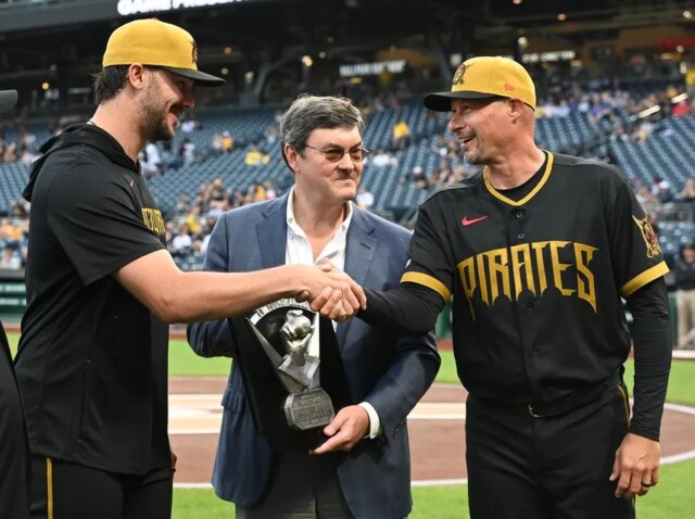 17 de abril de 2026; Pittsburgh, Pensilvânia, EUA; O arremessador titular do Pittsburgh Pirates, Paul Skenes (à esquerda), aperta a mão do técnico Don Kelly, à direita, ao receber seu prêmio Cy Younger do proprietário Bob Nutting antes de um jogo contra o Tampa Bay Rays Tampa Bay Rays no PNC Park. Crédito obrigatório: Philip G. Pavely-Imagn Pictures