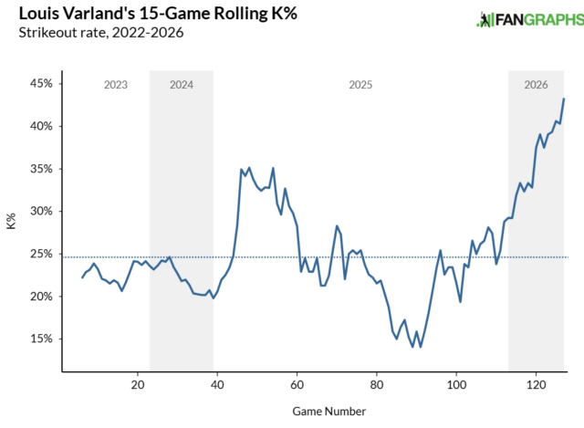 Os resultados impecáveis de Varland em 2026 podem vir de uma pequena amostra, mas são sem precedentes para ele. O destro passou por momentos semelhantes mantendo as corridas fora do tabuleiro, como quando produziu um ERA igual de 0,56 em 15 jogos do last de junho ao início de julho do ano passado, mas seus números subjacentes são muito mais impressionantes agora. Mais notavelmente, ele está eliminando rebatedores em uma taxa diferente de tudo que conseguiu em um período semelhante.
