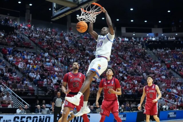 22 de março de 2026; San Diego, CA, EUA; O atacante do Kansas Jayhawks, Flory Bidunga (40), enterrou contra o St. John’s Pink Storm no segundo tempo, durante um jogo da segunda rodada do torneio masculino da NCAA de 2026 na Viejas Enviornment. Crédito obrigatório: Kirby Lee-Imagn Photographs