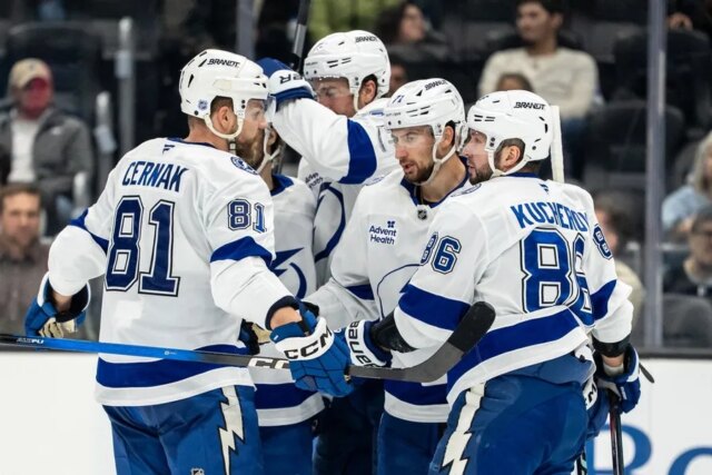Nikita Kucherov marcou três gols e deu duas assistências na vitória do Tampa Bay Lightning sobre o anfitrião Seattle Kraken por 6 a 2 na terça-feira.