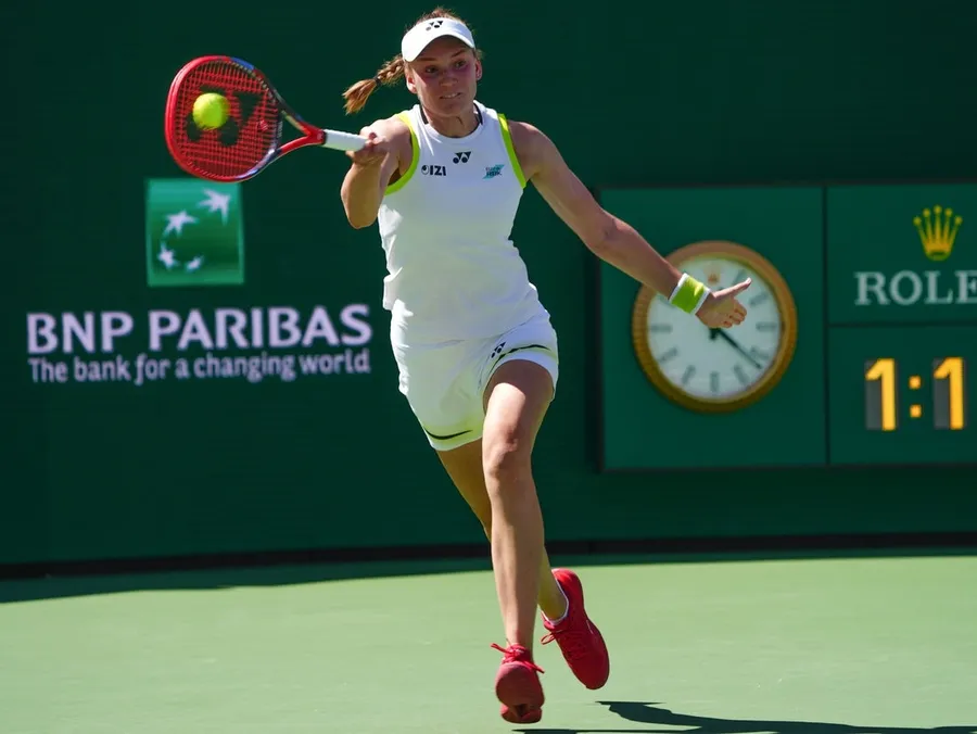 Elena Rybakina acerta um chute contra Aryna Sabalenka durante o BNP Paribas Open em Indian Wells, Califórnia, em 15 de março de 2026.