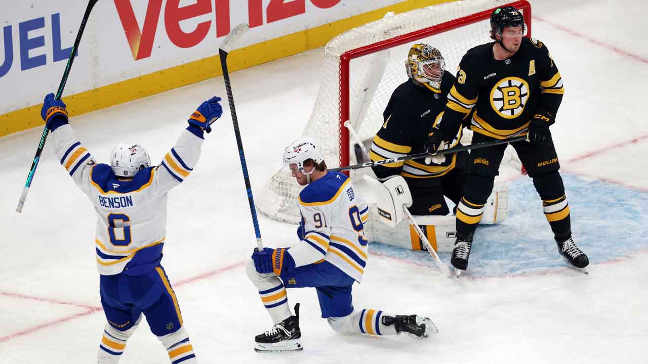 Peyton Krebs, Zach Benson e Bowen Byram também marcaram para ajudar o Buffalo a abrir uma vantagem de 4 a 0 contra um time de Boston que precisava de uma vitória em casa para evitar ficar à beira da eliminação. Beck Malenstyn e Alex Tuch marcaram com 84 segundos de diferença no terceiro período para fazer o 6-0 e perseguir o goleiro do Bruins, Jeremy Swayman.