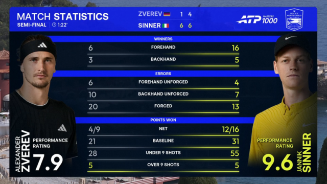 Sinner converteu todos os quatro break factors ao longo do encontro de 82 minutos, quando o italiano derrotou Zverev por 6-1 e 6-4 no Courtroom Rainier III.