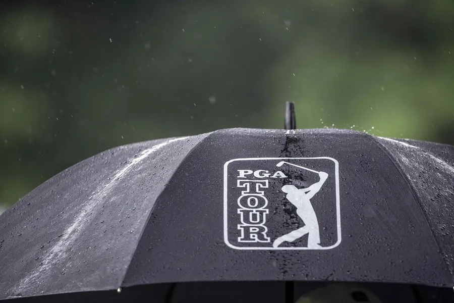 10 de julho de 2021; Silvis, Illinois, EUA; Uma foto detalhada da chuva atingindo um guarda-chuva do PGA Tour durante a terceira rodada do torneio de golfe John Deere Traditional. Crédito obrigatório: Marc Lebryk-Imagn Photographs