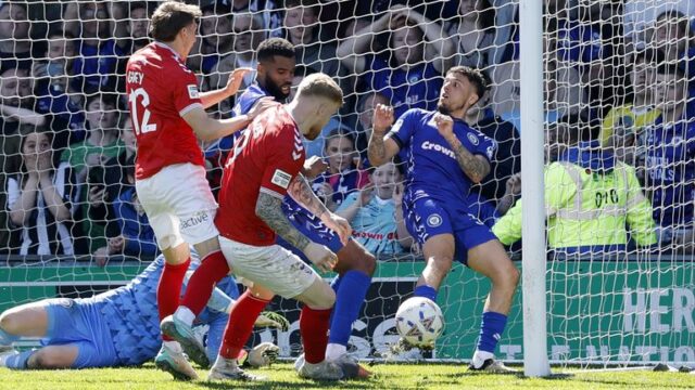 Ele forçou a bola por cima da linha em uma grande confusão depois que York lançou 10 jogadores para frente, um gol confirmado depois que o árbitro Will Finnie consultou seu assistente – provocando outra invasão de campo, desta vez por torcedores visitantes.