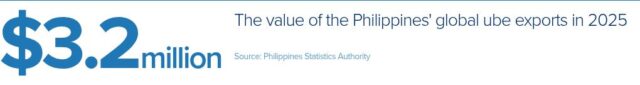 As exportações de ube das Filipinas aumentaram acentuadamente nos últimos anos. Em 2025, as Filipinas enviaram cerca de 3,2 milhões de dólares em ube – quase 1,7 milhões de quilogramas – marcando um aumento de cerca de 20% em relação ao ano anterior, de acordo com dados da Autoridade de Estatística das Filipinas (PSA) partilhados com a CNBC.