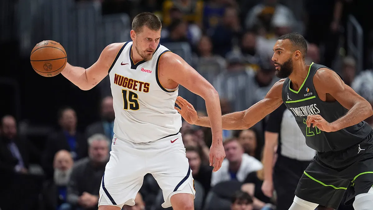 O pivô do Denver Nuggets, Nikola Jokic, tenta passar a bola enquanto o pivô do Minnesota Timberwolves, Rudy Gobert, defende no segundo tempo de um jogo da NBA em Denver, em 1º de abril de 2025. (David Zalubowski/AP)
