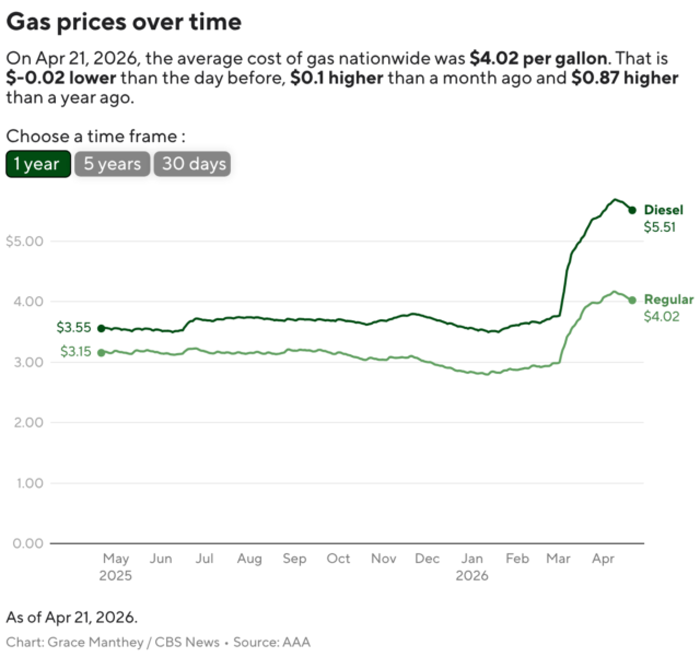 “Se o estreito fosse reaberto amanhã – talvez no last de outubro, novembro, dezembro – a média nacional poderia cair abaixo de US$ 3 o galão”, disse Patrick De Haan, especialista em petróleo da GasBuddy, à CBS Information na segunda-feira. “Mas isso certamente não é uma garantia.”