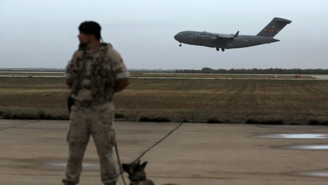 Avião da Força Aérea dos EUA voa antes de pousar na base aérea militar de Moron, no sul da Espanha. (Marcelo del Pozo/Reuters)